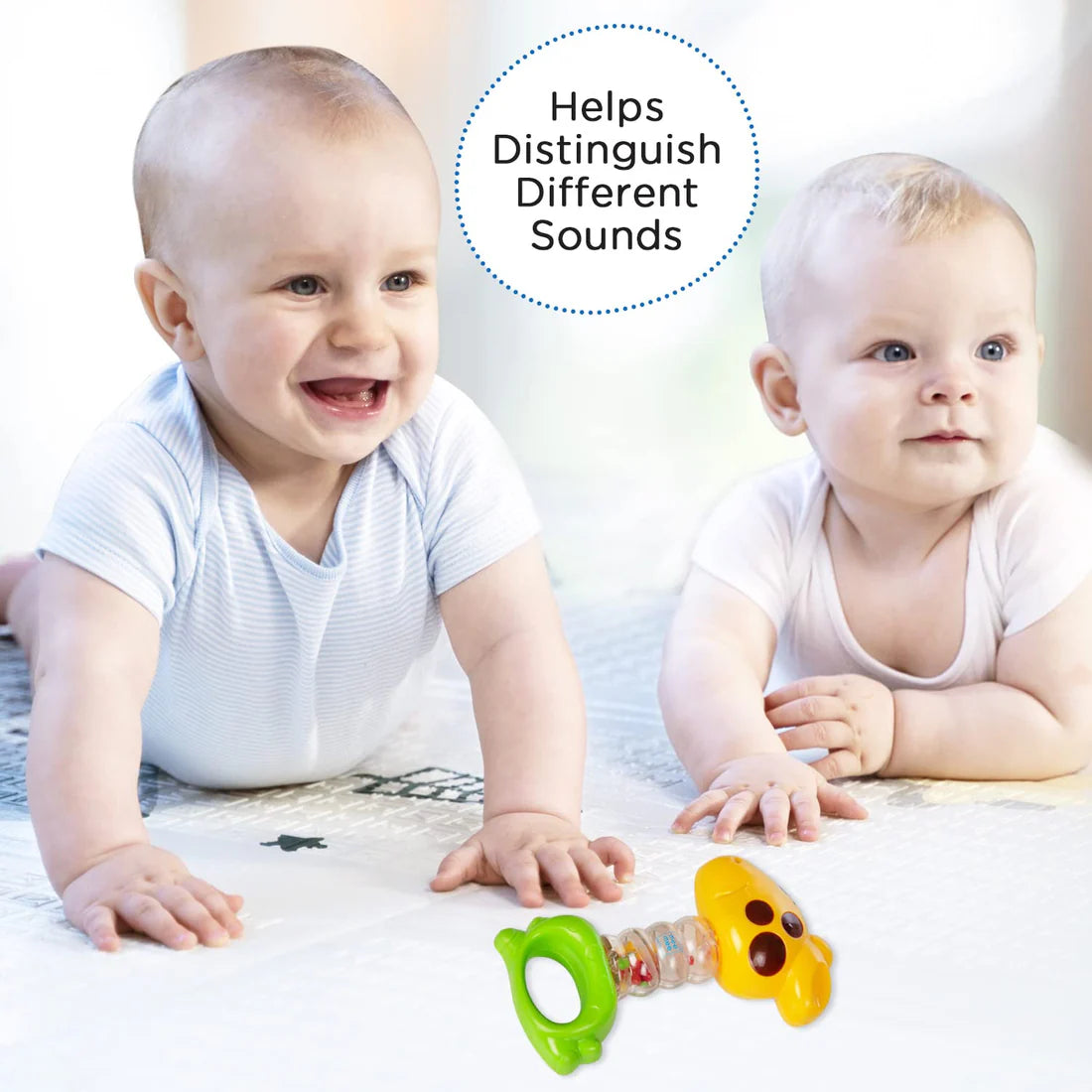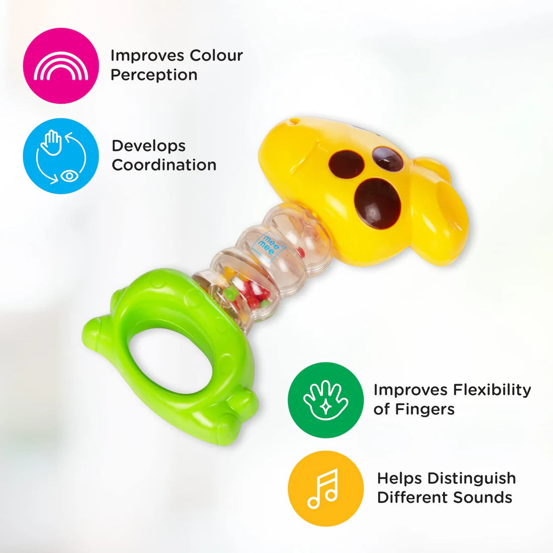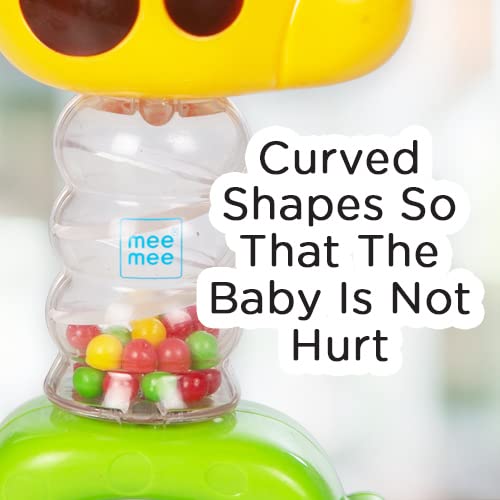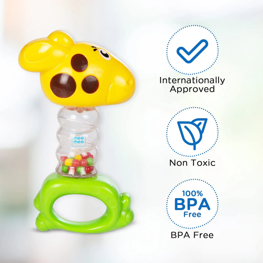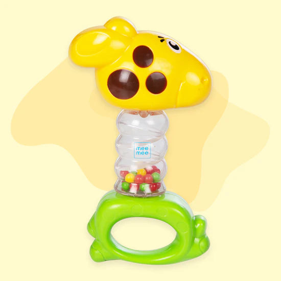No happy feeling can compare to the one you feel while watching your baby laugh and play. Mee Mee 360° Rotating Rattle with Baby Grip Design is especially for your baby to be occupied and entertained for hours together. Giraffe Shaped Rattle is brightly coloured and decorated with smiling face and beads to attract your baby's eye and become his/her favourite toy. This toy is easy to store thus ensuring your baby always has company while travelling. Curved shapes without any sharp edge so that the baby is not hurt. Sized according to baby’s palm for easy holding, playing and for boosting hand-eye coordination and strengthens baby’s grip and tactile aptitude.